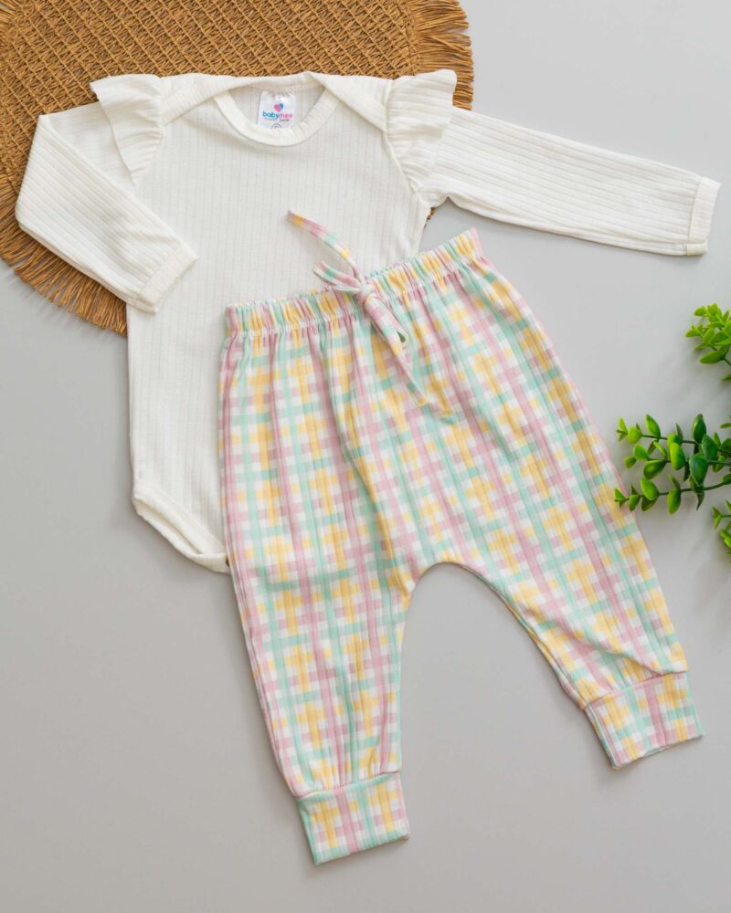 Conjunto Body Babado Off e Calça Bebê Canelada Estampada Xadrez Rosa