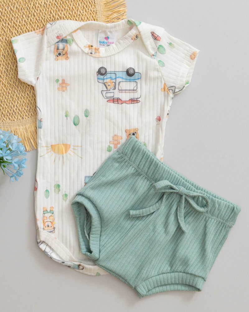 Conjunto Body e Tapa Fralda Canelado Bebê Estampado Kombi