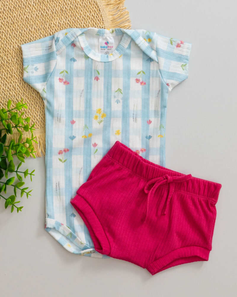 Conjunto Body e Tapa Fralda Rosa Pink Canelado Bebê Estampado Flores
