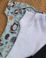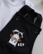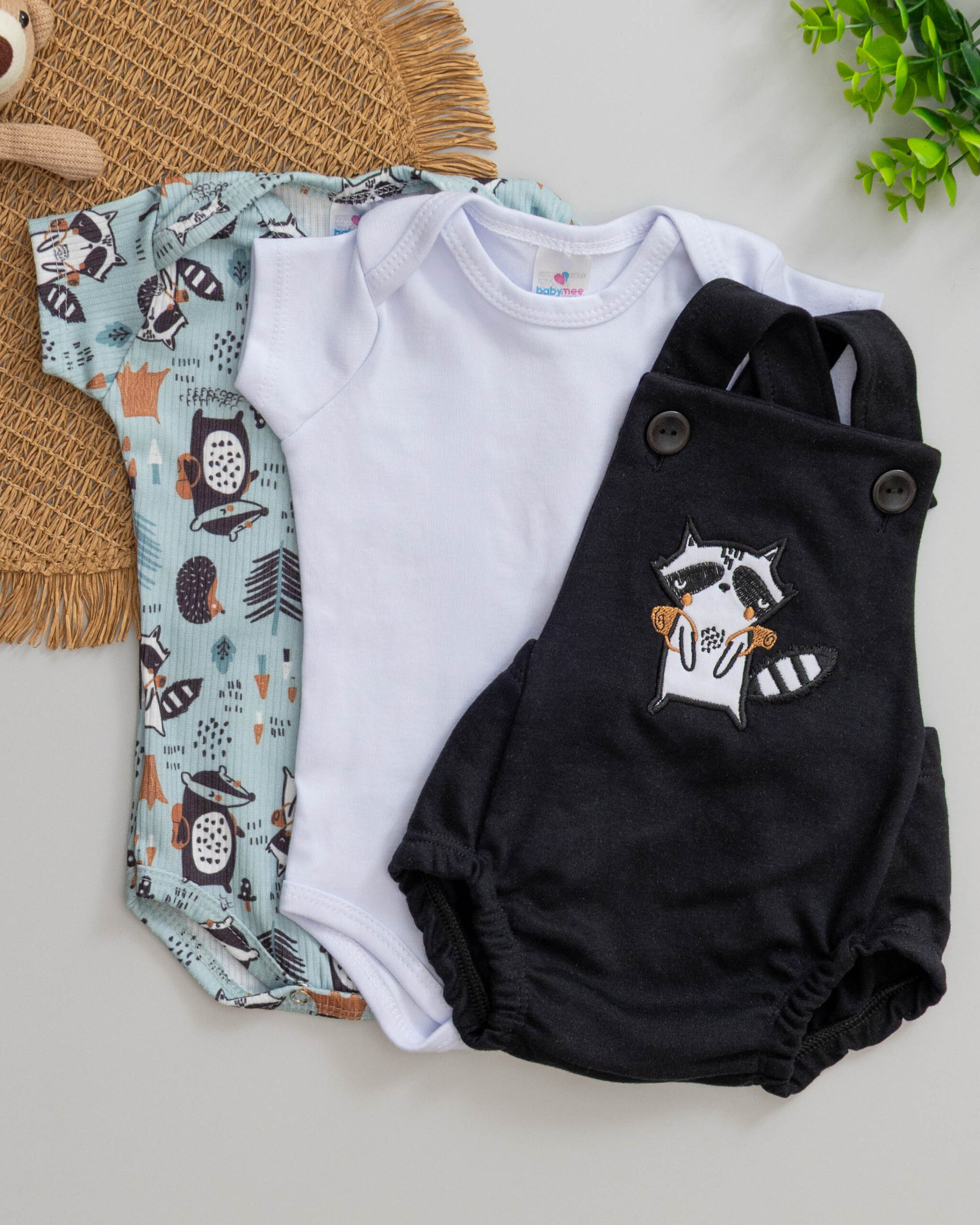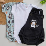 Kit 3 Peças Jardineira Romper e Body Bebê Guaxinim