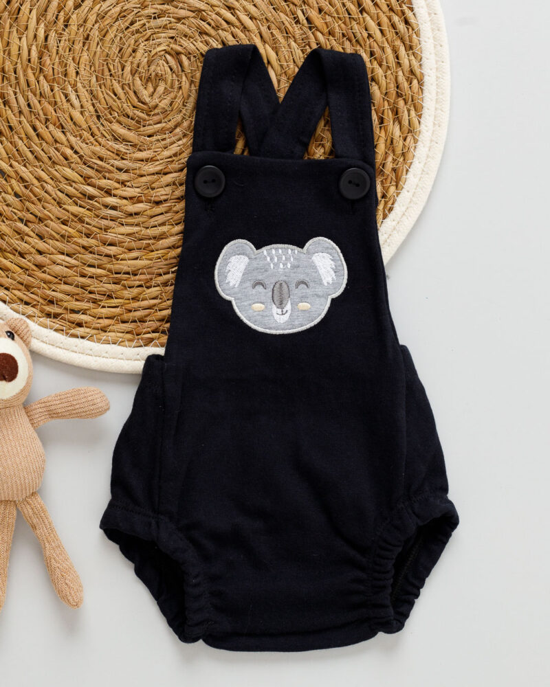 Jardineira Bebê Romper Suedine Preto Bordado Coala