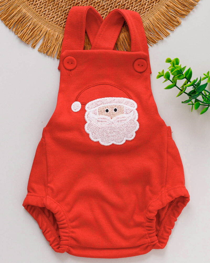 Jardineira Bebê Romper Natal Suedine Vermelho Bordado Papai Noel