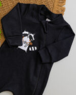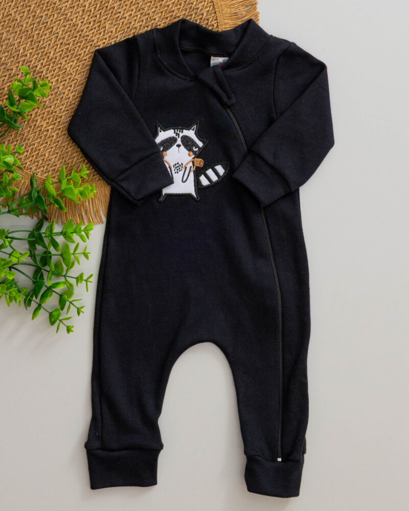 Macacão Bebê Suedine Preto Bordado Guaxinim Aventureiro