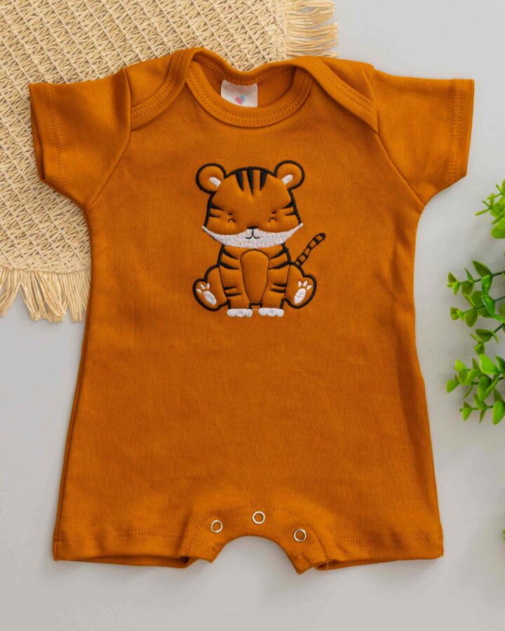 Macacão Curto Bebê Romper Suedine Bordado Tigre