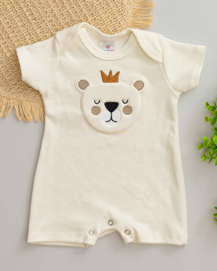 Macacão Curto Bebê Romper Suedine Bordado Ursinho Coroa