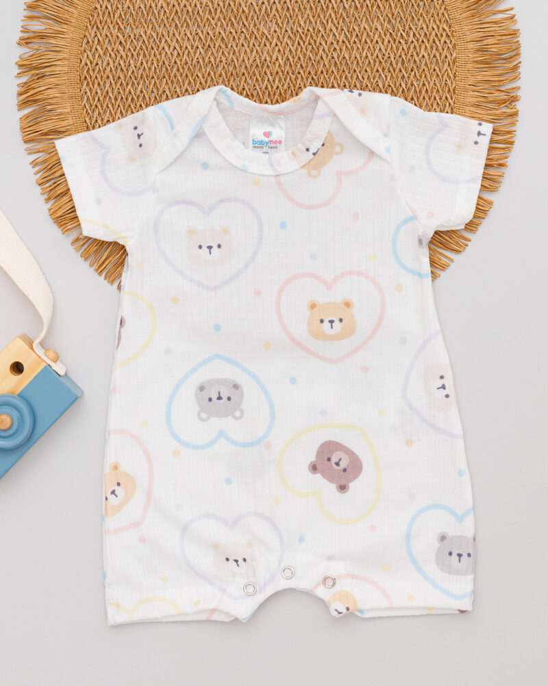 Macacão Curto Bebê Romper Canelado Estampado Coração Ursinho